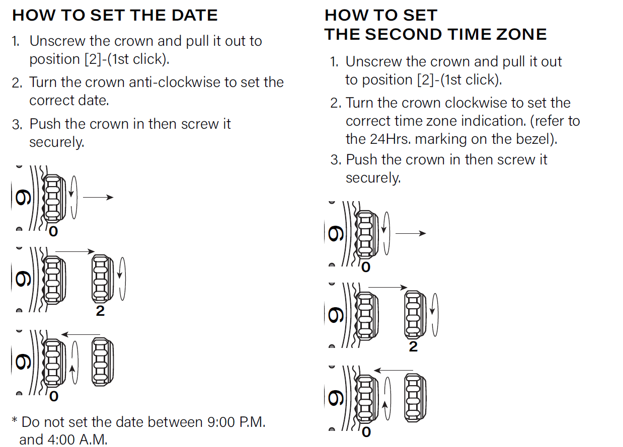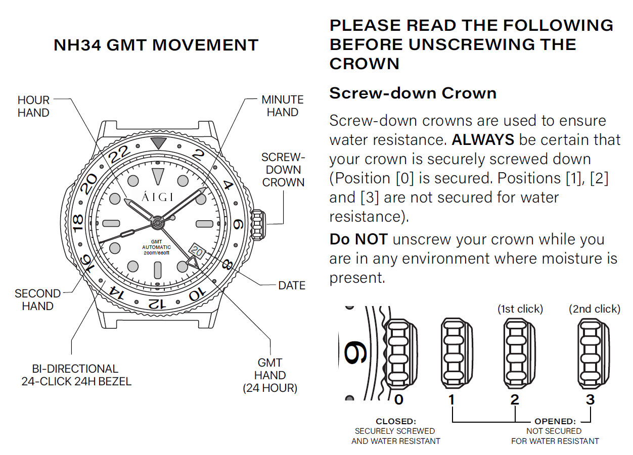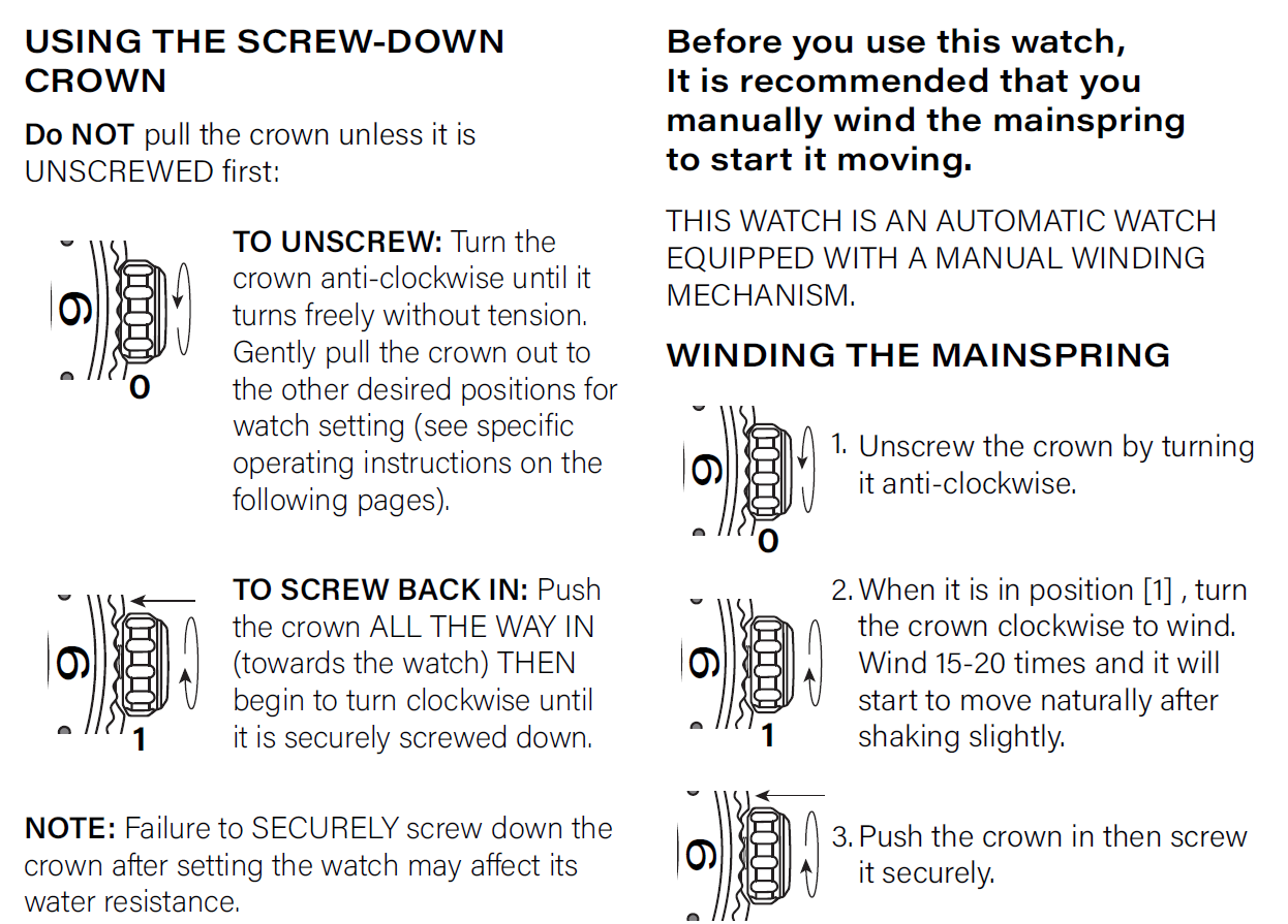 Denne klokken er 20 ATM vanntett, noe som betyr at du kan bruke den til svømming eller dykking. Den er utstyrt med en innskrudd krone som betyr at du må skru ut kronen hvis du vil stille inn tiden eller endre dato. Det er viktig at kronen er skrudd helt inn hvis du bruker den i vann eller i omgivelser med høy luftfuktighet.