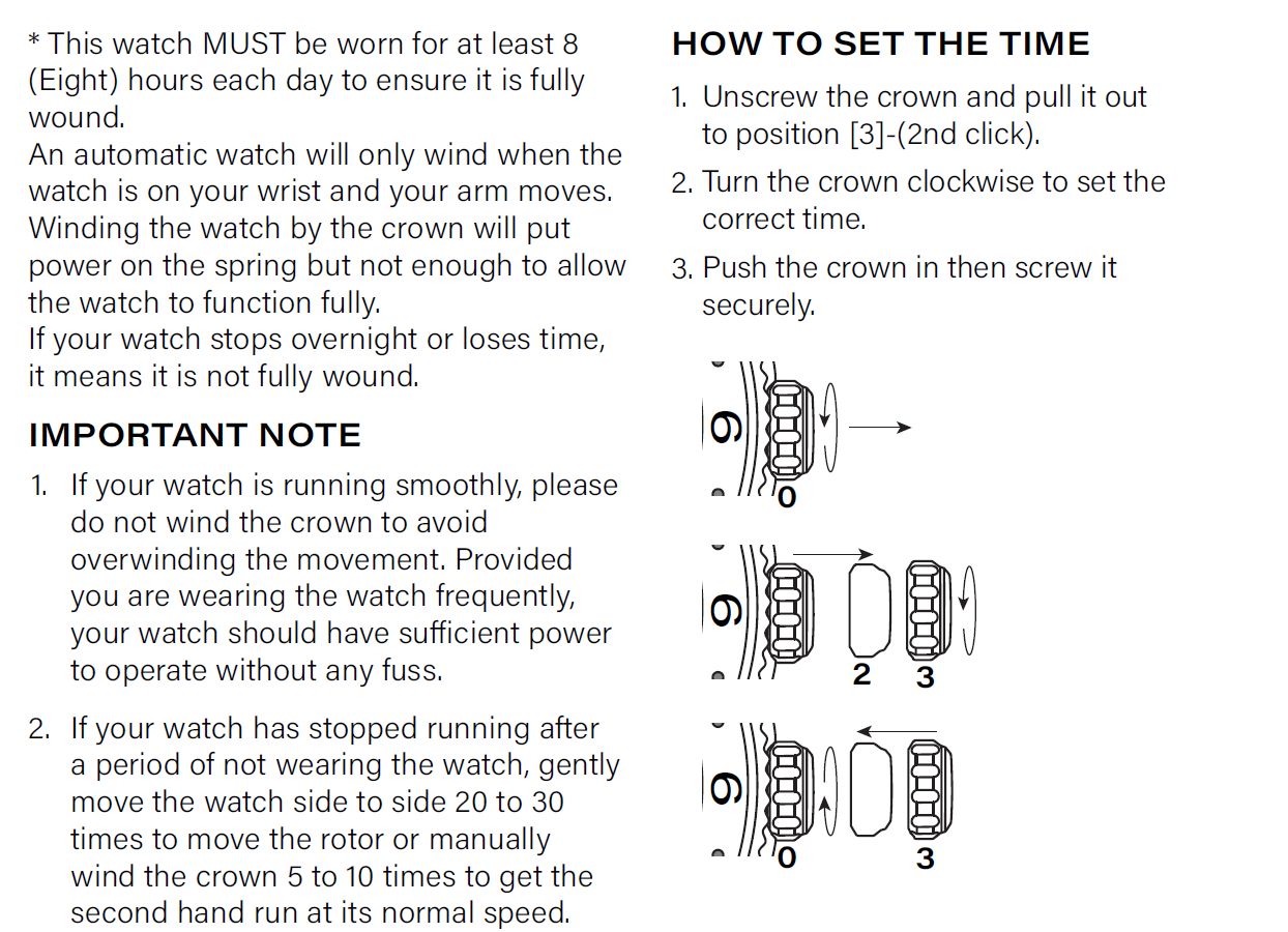 derfor nok for automatisk oppvikling av klokken og den vil gå gjennom natten hvis du tar den av for å sove.
