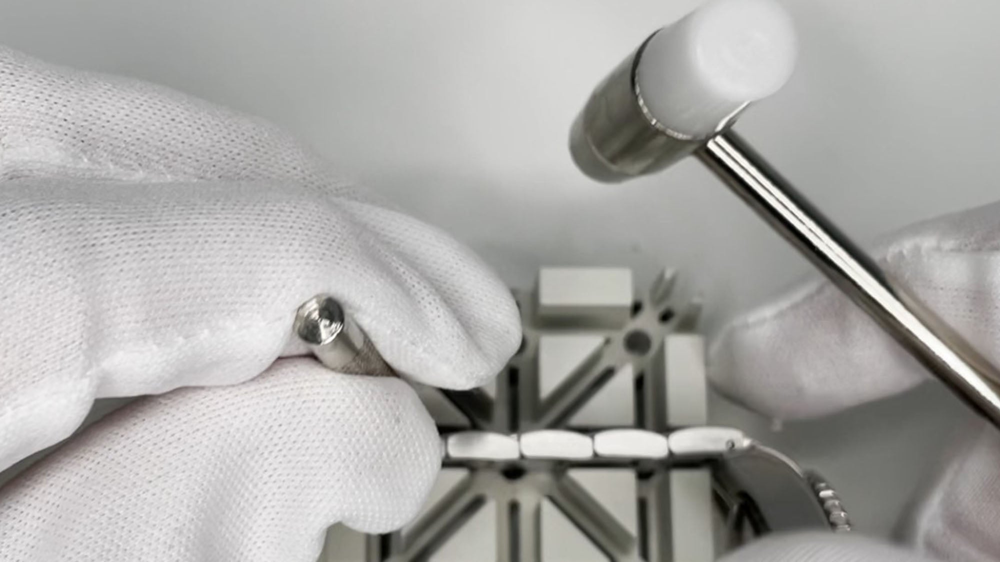 Reimen er festet til urkassen ved hjelp av spring bars. Det følger med et lite verktøy i esken, samt to ekstra spring bars og leddfester i reserve.